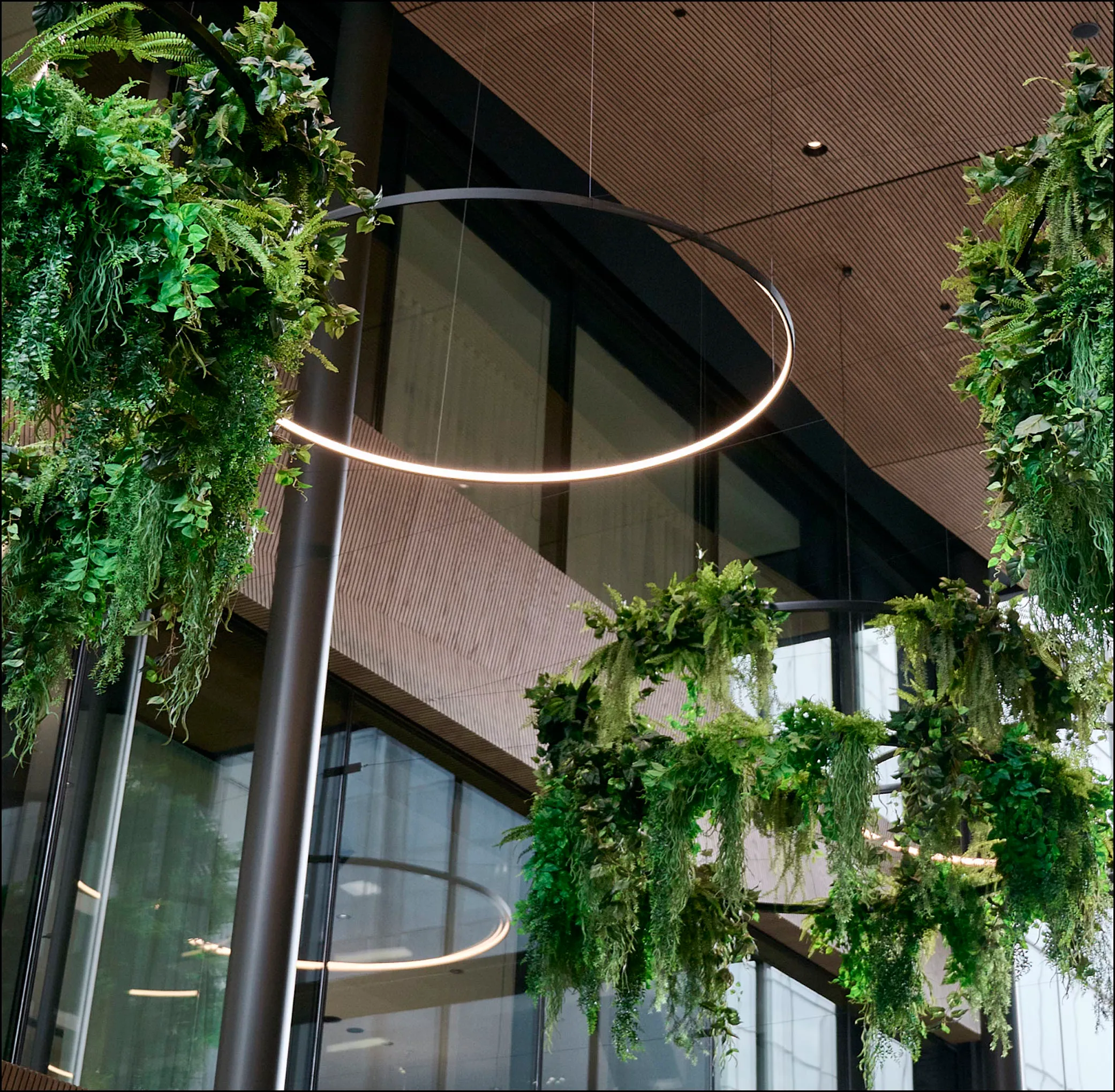 Bespoke green spaces for 44 Bowen Street start with a series of custom plant chandeliers.