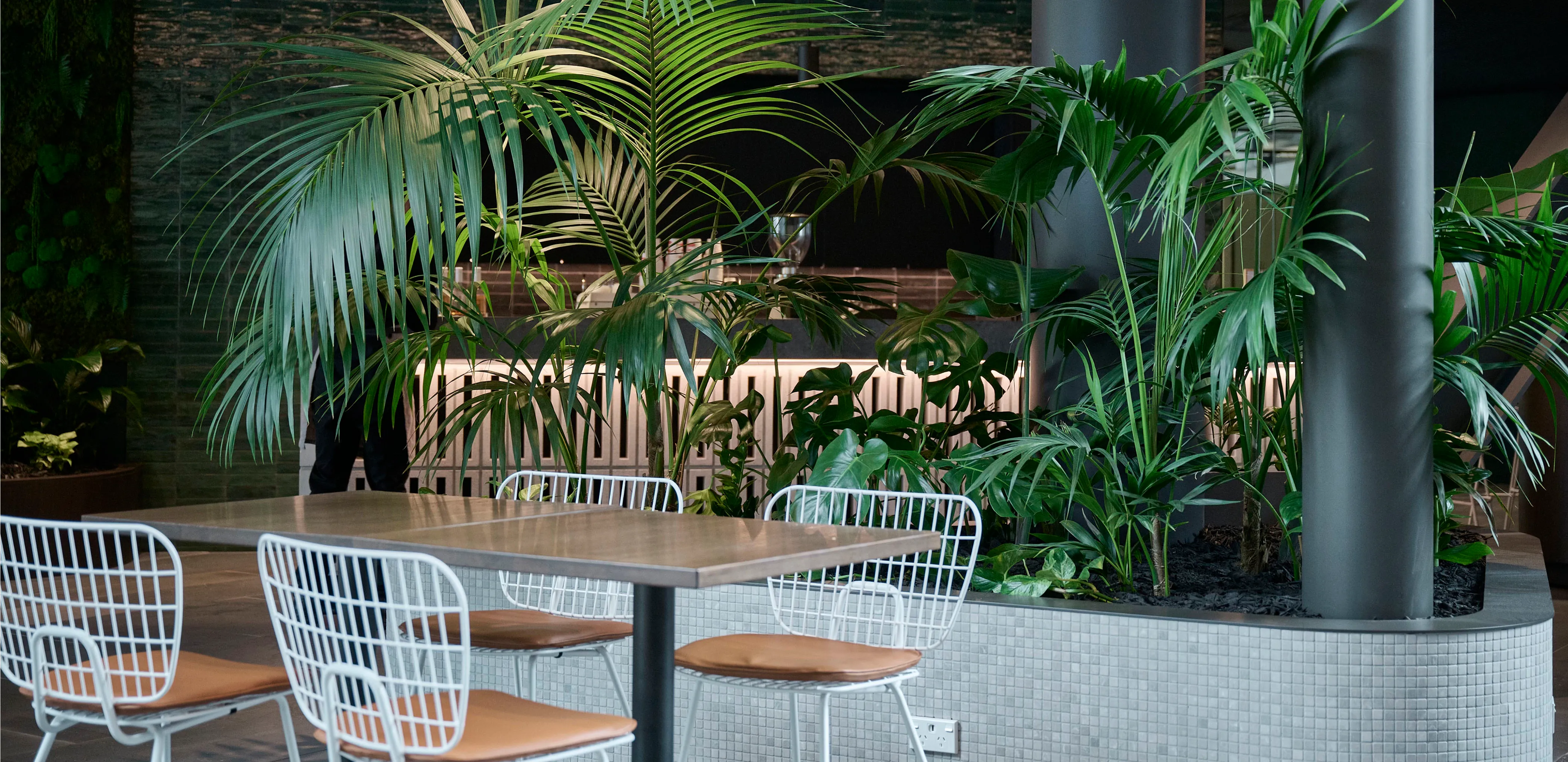Outside In applied biophilic design principles to ensure the many planted elements are not only aesthetically pleasing – they also provide a restful and welcoming presence to those experiencing the space. Plant chandeliers are a unique feature that draws attention to the building’s form. Their placement invites you to take a moment to relax and gaze up towards the expansive ceiling and the plentiful natural light. Other bespoke greenery includes a handcrafted moss wall, which provides a green backdrop to integrated booth seating. Preserved ferns were inserted into this work to add density, texture and realism.