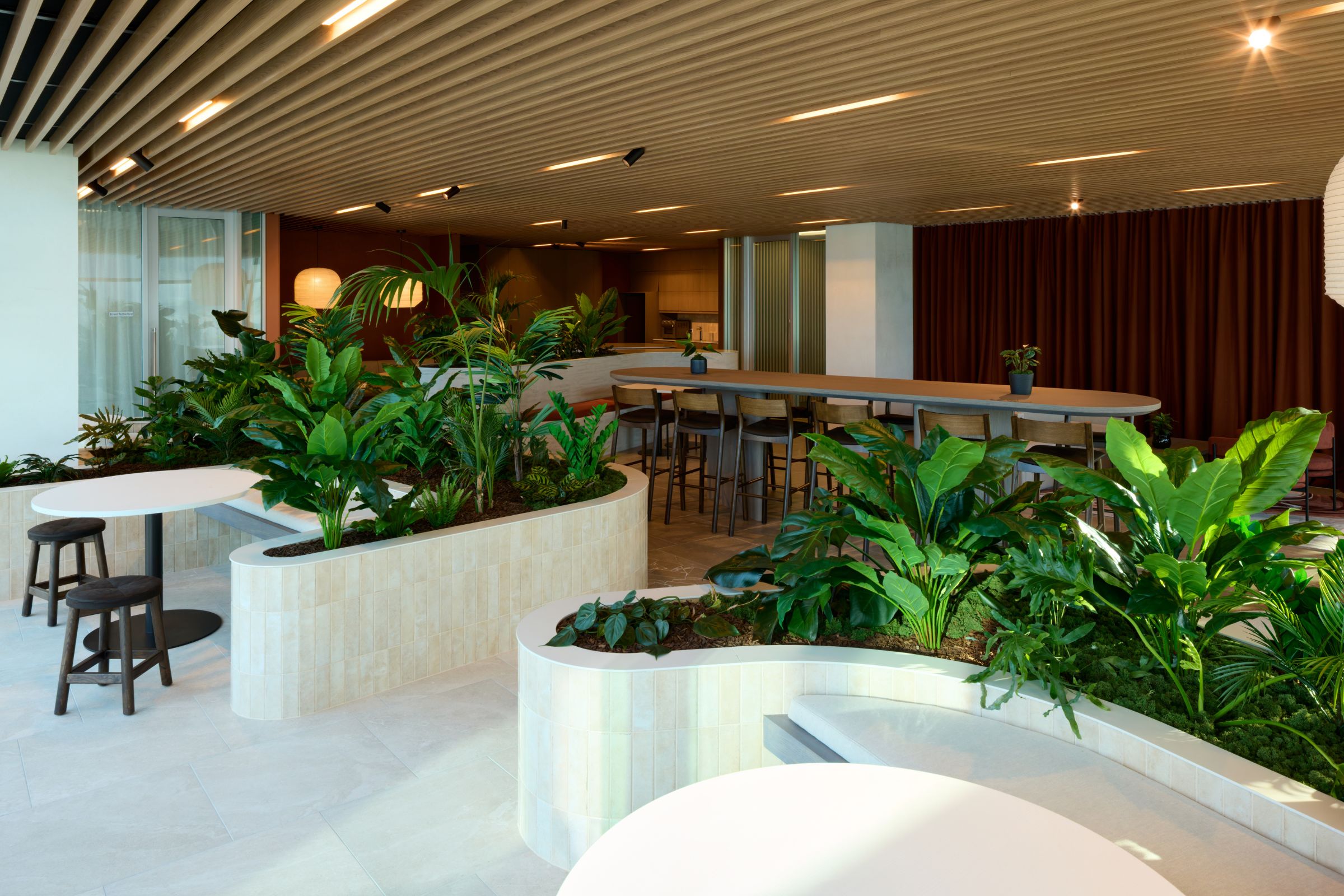 Planting was strategically placed to invite movement, define zones, and soften light while maintaining sightlines to exterior views. Every detail was refined in close collaboration with DGSE. Curved tiled planters and overhead ring planters mirror the architecture’s organic flow, integrating lighting and greenery as one cohesive design language. A handcrafted moss logo acts as a living expression of Secruitease’s creative identity and provides a distinctive focal point for visitors and staff alike.